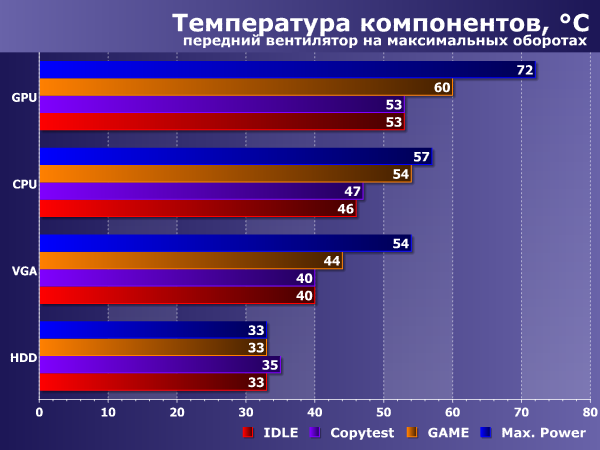 Температура компонентов находится на вполне нормальном уровне при работе фронтального корпусного вентилятора как в максимальном, так и в минимальном положении регулятора. Задний вентилятор был запитан непосредственно от блока питания номинальным напряжением 12 В. Возрастание температуры при минимальном положении регулятора заметно мало.