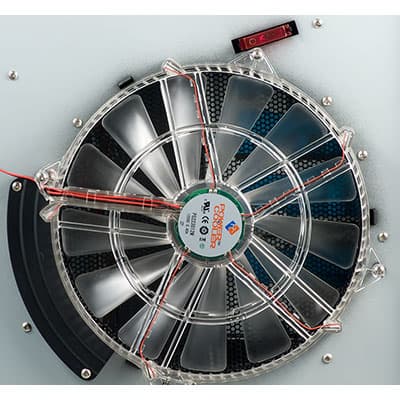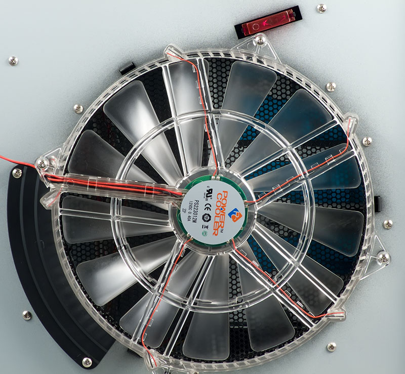 В шасси корпуса предусмотрено два посадочных места для вентиляторов: одно спереди для вентилятора типоразмера 120 мм, куда установлен вентилятор с подсветкой, сзади предусмотрено универсальное посадочное место для вентиляторов типоразмера 80/92/120 мм. На боковой стенке установлен вентилятор большого диаметра с возможностью переключения направления воздушного потока и регулировкой скоростью вращения, он также имеет встроенную подсветку. У корпусов, имеющих черный окрас, подсветка имеет красный цвет, у корпусов серебристо-черных — голубой цвет. Подсветка большого вентилятора отключаемая.