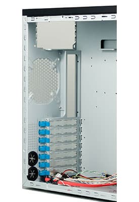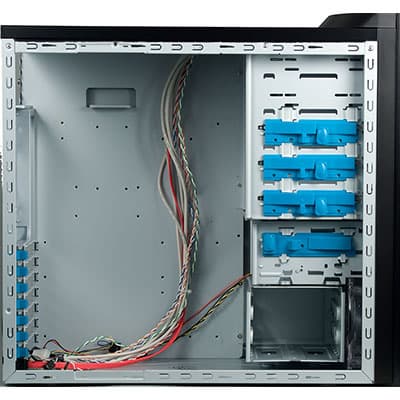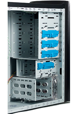 По сути, корпус выполнен на среднебюджетном шасси и также является среднебюджетным решением. Причем, используемое шасси не лучшее в своем классе и также имеет некоторые недостатки среди которых, прежде всего, неудачная конструкция крепления жестких дисков.