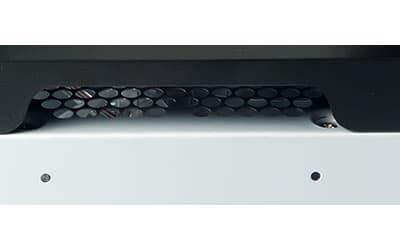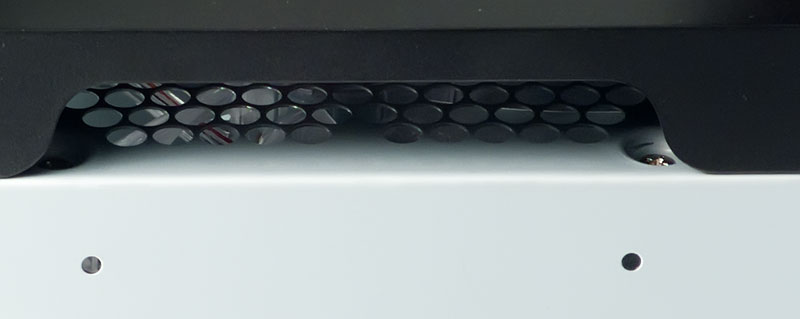 Передняя панель выполнена из пластика, окрашенного в массе, декоративные элементы в виде крыльев по бокам передней панели выполнены из алюминия толщиной около 3 мм, то есть они не гнутся. В нижней части лицевой плоскости передней панели расположено вентиляционное отверстие, под которым установлен пылевой фильтр из поролона толщиной около 40 мм. Вообще, есть сильные подозрения, что через такой "фильтр" будет проходить хоть какой-то воздушный поток в сторону вентилятора, зато воздух, правда вместе с пылью, будет проходить через отверстие, расположенное на нижнем торце передней панели, так как расположено оно уже после фильтра и перед вентиляторов. Так что номинально фильтр есть, на фактически выполнять свою работу он не будет.
