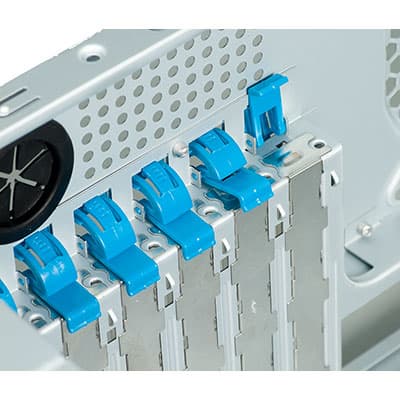 Установка плат расширения в корпусе производится при помощи безвинтовой системы крепления, возможна дополнительная фиксация винтом. При использовании только безвинтовой системы крепления установить плату можно, но при этом она будет иметь заметный люфт в вертикальной плоскости, поэтому лучше винтом ее все же зафиксировать. В корпусе допускается установка плат расширения, в том числе видеокарт, длиной до 28 сантиметров. Расстояние от верхнего края системной платы до блока питания составляет около 20 мм.