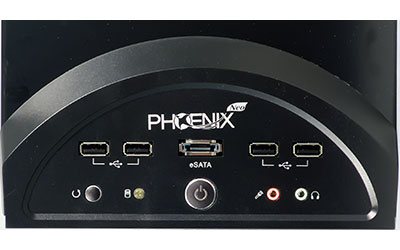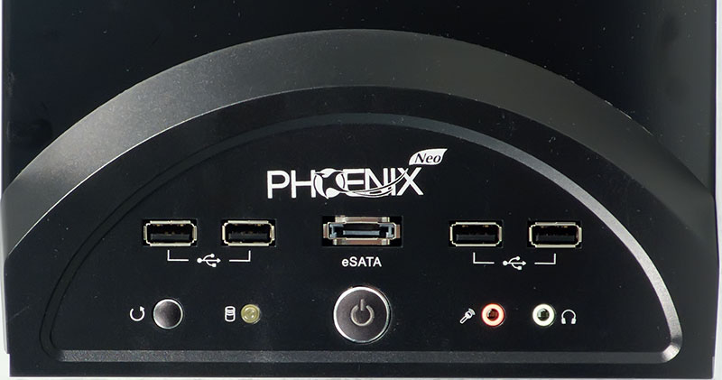 В состав блока входят: 4 порта USB, порт eSATA и 2 аудиоразъема. Порты USB расположены двумя парами, возможно одновременное использование двух устройств с габаритной околоконнекторной частью. Размер кнопок включения и перезагрузки вполне комфортен для использования владельцами пальцев любого размера, кнопки имеют небольшой люфт в продольной плоскости, но он не обращает на себя внимание и не мешает.