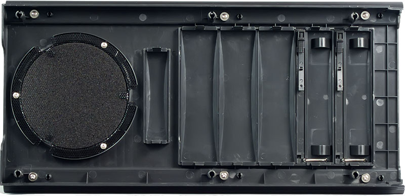 Жесткие диски устанавливаются в нижний отсек при помощи пластиковых салазок, что само по себе уже является недостатком, так как сильно снижает теплопередачу от корпуса жесткого диска к шасси корпуса.