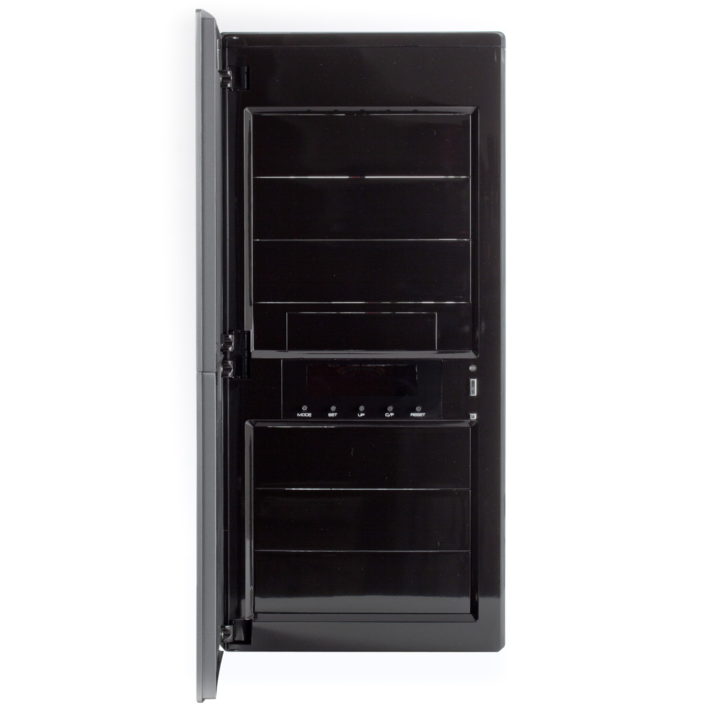 Компоновка корпуса поначалу кажется вполне обычной: блок питания располагается сверху, верхняя крышка корпуса без вентиляционных отверстий; но это лишь на первый взгляд… Сто́ит только снять боковую крышку, и становится ясным: слотов для 5,25-дюймовых устройств действительно девять, расположены они продольно, а 3,5-дюймовые устройства крепятся с помощью двух съемных корзин-переходников — одна с тремя посадочными местами, вторая с одним местом (она может использоваться для устройств, которым нужен выход на лицевую панель корпуса).