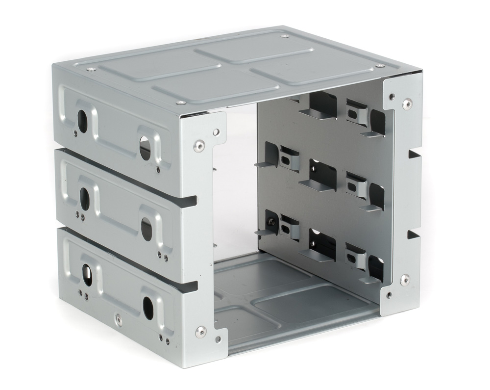 3,5-дюймовые устройства, как уже отмечалось, устанавливаются в корзины-переходники и крепятся винтами. Винты завернуть непросто, особенно при установке HDD в трехместную корзину: крепеж приходится просовывать в небольшое отверстие, и без намагниченной отвертки тут не обойтись. В трехместной корзине контакт корпусов жестких дисков с металлом само́й корзины ограничен лишь четырьмя точками в местах крепления, а потому теплоотвод будет затруднен; в одноместной корзине площадь контакта гораздо больше.
