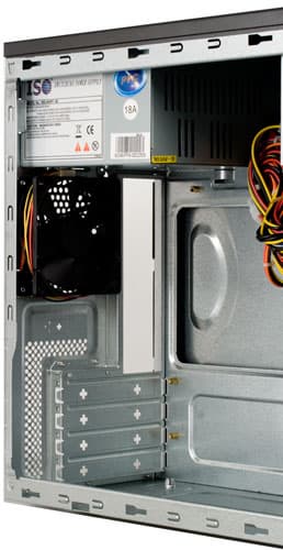 Конструкция корпуса в целом не вызывает нареканий: он жёсткий, не «ходит ходуном» даже при попытках вынудить его к этому. Честно говоря, в процессе тестирования один из наших инженеров даже пару раз сел на него сверху, как на табуретку :). Расположение отсеков для устройств, платы и БП, является одной из версий компромисса между удобством и размером, что характерно для любого mATX-корпуса. С нашей точки зрения, в данном случае баланс между этими двумя характеристиками близок к оптимальному.