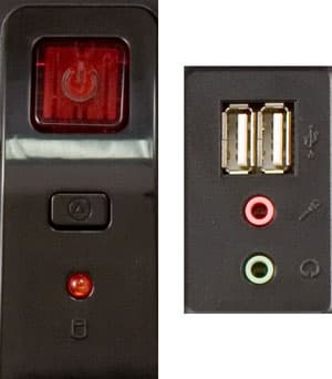 Передняя панель содержит минимум разъёмов, но всё что нужно — в наличии: два USB, наушники, микрофон. Правда, автор до сих пор не может понять, зачем на лицевой панели подавляющего большинства компьютерных корпусов кроме разъёма для подключения наушников присутствует ещё и микрофонный: человека, который бы использовал на компьютере микрофон, ему доводилось видеть 1 (один) раз в жизни. Но поскольку данный заговор явно имеет всемирные масштабы, будем считать, что разъёмы для наушников и микрофона действительно неотделимы друг от друга :).