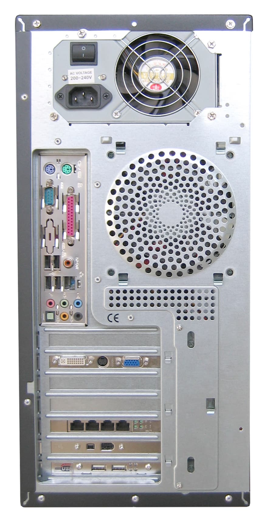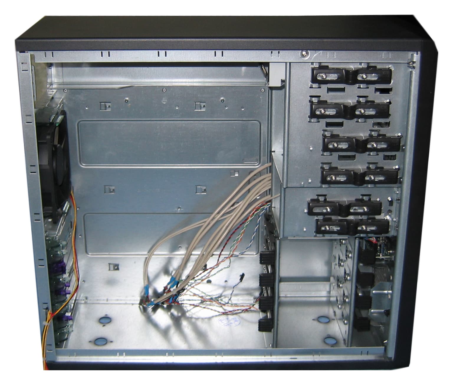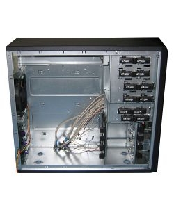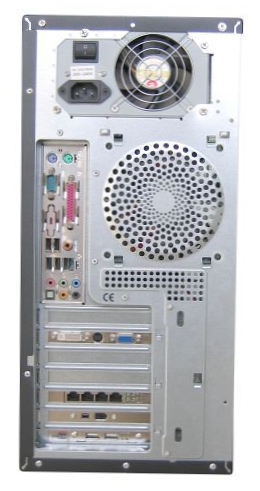 Радует то, что данная модель уже в заводской комплектации снабжена вентилятором на задней панели — владельцам систем на базе последних процессоров Intel, корпусной вентилятор совсем не помешает. Также имеется место для установки 80 мм вентилятора на передней панели, и учитывая тот факт, что вентилятор комплектного блока питания постоянно вращается со скоростью 2500 оборотов в минуту, более логичным решением видится комплектация данного корпуса вместо 120 мм вентилятора для установки на задней панели 80 мм вентилятором для передней панели. Что обеспечило бы более равномерный воздухообмен с внешней средой, то есть объем воздуха, забранного снаружи, примерно был бы равен объему воздуха, отданному наружу.