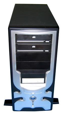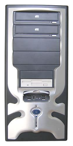 Корпус выглядит солидно, да и весит тоже. Строгий чёрный цвет, серебристая "декорация" на лицевой панели… Впрочем, как раз последняя — строго "на любителя", нам она показалась излишне вычурной, да и многим пользователям, предпочитающим строгость в дизайне, она вряд ли придётся по вкусу. Словом, в офисе такой корпус вряд ли будет выглядеть уместно.