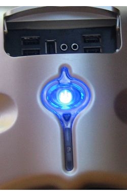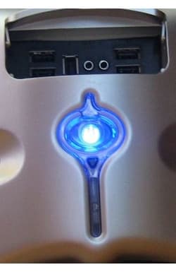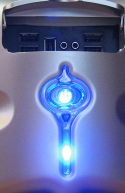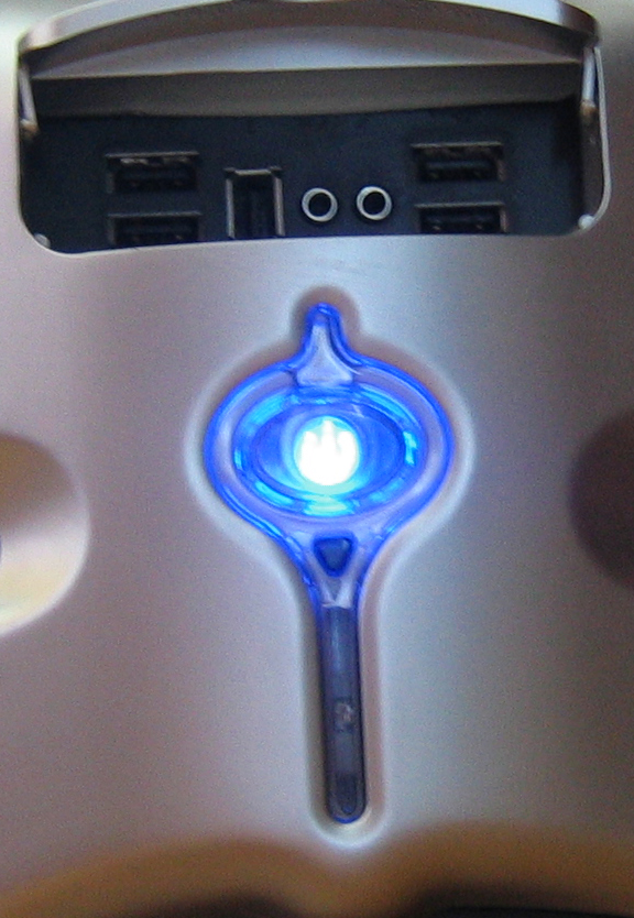 В реальности это приводит к тому, что "краем глаза" уловить, происходит ли в данный момент обращение к жесткому диску, реально только в том случае, если обращение "рваное" (тогда это видно по миганию). Если же обращение длительное — то два синих светодиода просто равномерно "засвечивают" декоративную накладку, и непонятно — то ли компьютер просто включен, то ли ещё и идёт работает с ЖД.