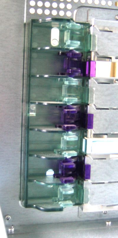 C одной стороны, отсеки для жестких дисков удобны: всё то же tool free крепление на защёлках, ориентация ЖД "разъёмами наружу" облегчает их установку и снятие в собранном корпусе. С другой стороны, расстояние между разъёмами на ЖД и боковой стенкой корпуса находится "на грани фола": если с Parallel ATA дисками проблем никаких не предвидится, то вот с некоторыми "длинными" коннекторами на SATA-шлейфах может возникнуть проблема — шнур придётся отгибать вверх или вниз почти под прямым углом, чтобы он не мешал закрывать крышку. Флоппи-дисководы и 5" устройства устанавливаются также на защелки, конструкция которых достаточно стандартна и нареканий не вызывает. К сожалению (но это также привычная для подавляющего количества "навороченных" корпусов ситуация), для установки CD/DVD лицевую панель корпуса придётся снять. Отрадно, что чёрными крышками в цвет корпуса и механическими "удлинителями" кнопок (чтобы скрыть отличающиеся по цвету 5" устройства) снабжены два верхних отсека, а не один, как это часто встречается — тут Foxconn не экономила, и за это ей плюсик.