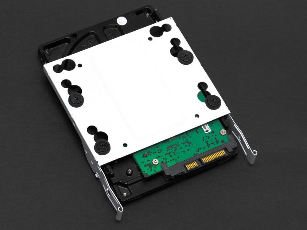 Для установки 3,5″ жестких дисков используется корзина на 2 посадочных места. Каждый диск вставляется в стальные салазки и фиксируется 4 винтами с плоской шляпкой. Между диском и винтом предусмотрены прокладки из мягкой резины, призванные гасить вибрацию. Отметим, что салазки являются универсальными, при желании в них можно установить и 2,5″ накопитель.