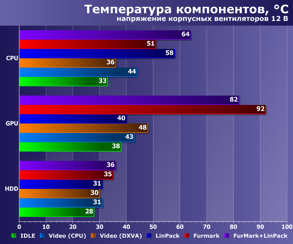 Отметим, что во время проведения всех тестов корпус был установлен в вертикальном положении, приток воздуха к боковым стенкам затруднен не был. Результаты тестов представлены на диаграммах: