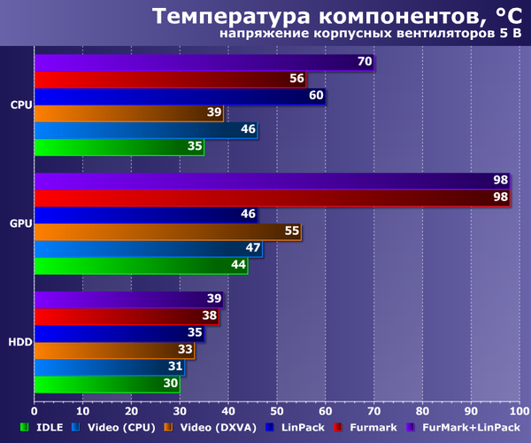 При запитывании вентиляторов от 5 В ситуация заметно ухудшается. Система охлаждения все еще справляется со своей задачей, компьютер не зависает и не уходит в перезагрузку, но долго эксплуатировать его с таким охлаждением и под максимальной нагрузкой определенно не стоит.