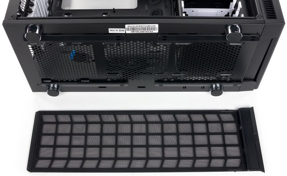 Фильтров также два — фронтальный и нижний, сделанные из мелкоячеистой капроновой сетки. Но если у фронтального изменилась лишь форма и размер ячеек декоративной рамки, то нижний изменился гораздо сильнее. Конструктивно это тоже рамка с сеткой, однако фильтр стал длиннее — он теперь закрывает нижнюю плоскость шасси целиком, что является необходимостью, поскольку отверстия теперь есть на всей площади днища. Но главное в другом: он выдвигается не назад, как в R4, а вперед. И это гораздо удобнее в случаях, когда задняя стенка компьютера находится вблизи вертикальной поверхности: отодвигать его для извлечения фильтра уже не потребуется.