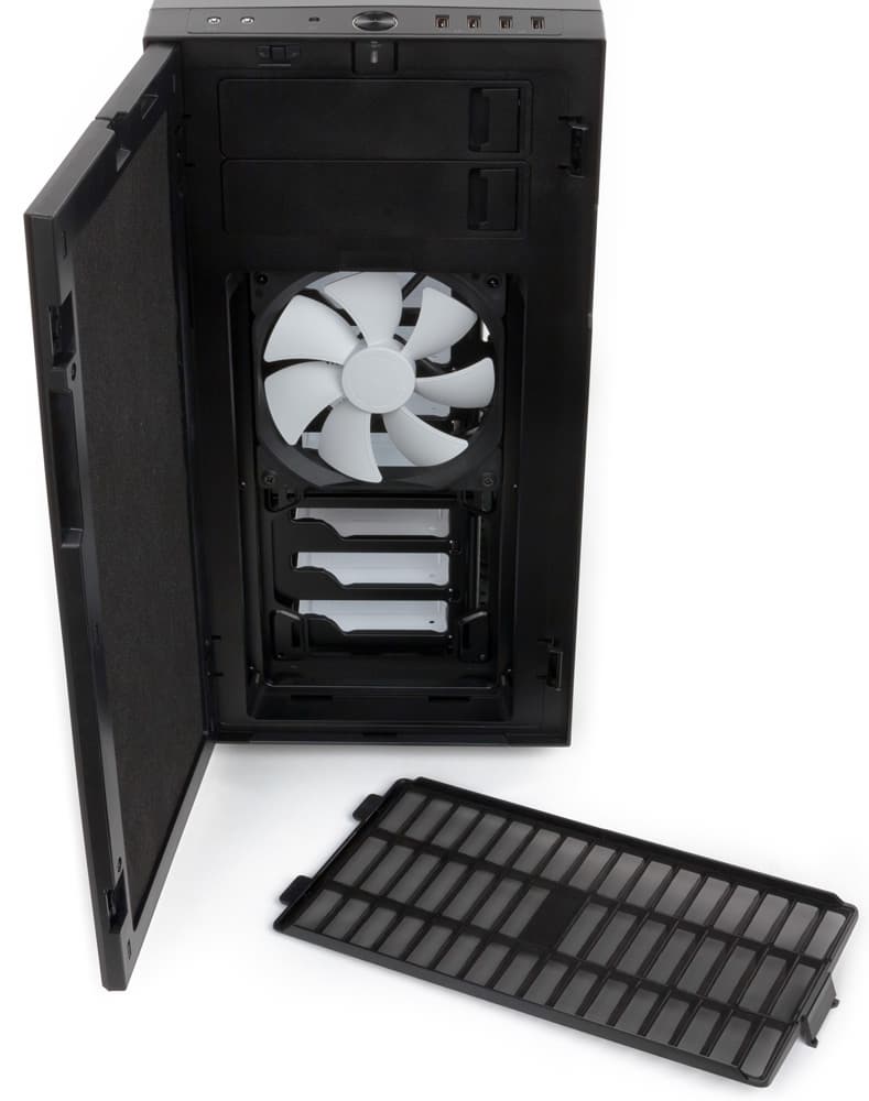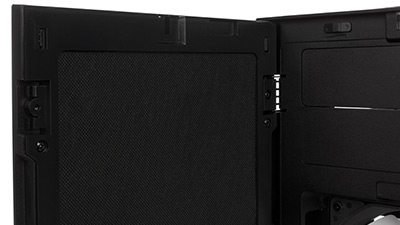 Фильтрация потоков воздуха вполне достаточна для имеющихся вентиляторов и очень удобна в обслуживании. Однако для дополнительных вентиляторов на верхней и левой поверхностях корпуса фильтров не предусмотрено, и при их установке избежать проникновения пыли внутрь компьютера не получится.