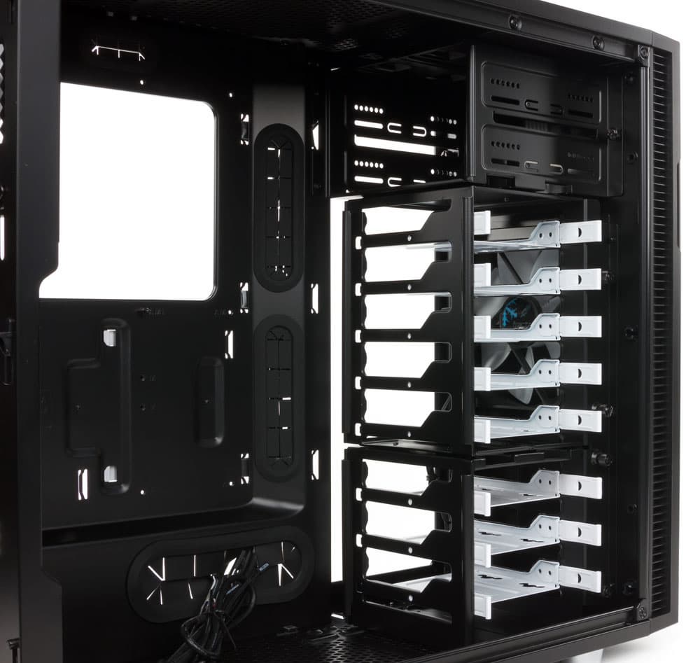 Десяти посадочных мест для жестких дисков и двух для оптических приводов будет достаточно для большинства владельцев. Можно посетовать лишь на отсутствие возможности установить 3,5-дюймовые устройства с выходом на лицевую панель.