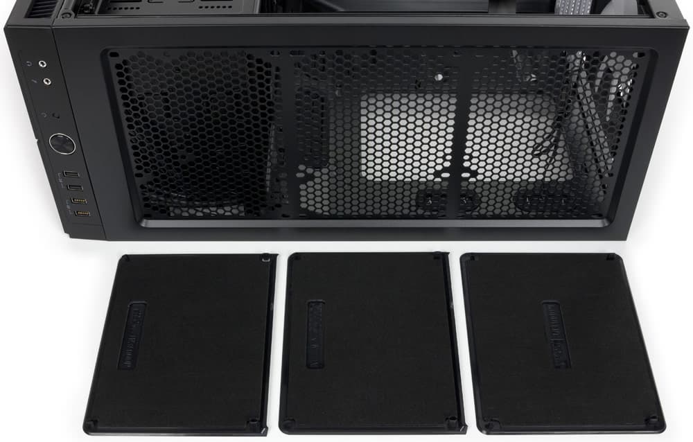 Неизменным осталось и использование концепции ModuVent™: при установке компонентов с повышенным тепловыделением заглушки в левой боковой и в верхней крышках корпуса можно удалить, открыв дополнительные отверстия для потоков воздуха; можно и установить вместо заглушек дополнительные вентиляторы. Общее число мест для вентиляторов увеличилось с 7 до 9: по два спереди и на днище, три вверху, по одному сзади и слева, все с возможностью установки 140- и 120-миллиметровых моделей. Опять-таки схожесть с точностью до деталей. Так, заглушек на верхней крышке корпуса уже не две, а три, и устанавливаются они не изнутри, а снаружи.