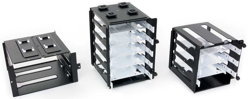 Состоящую из двух частей корзину для жестких дисков производитель решил не менять: ее конструкция в R4 была достаточно универсальной и удачной. Напомним: части не одинаковые, в одной размещается три накопителя, в другой пять.