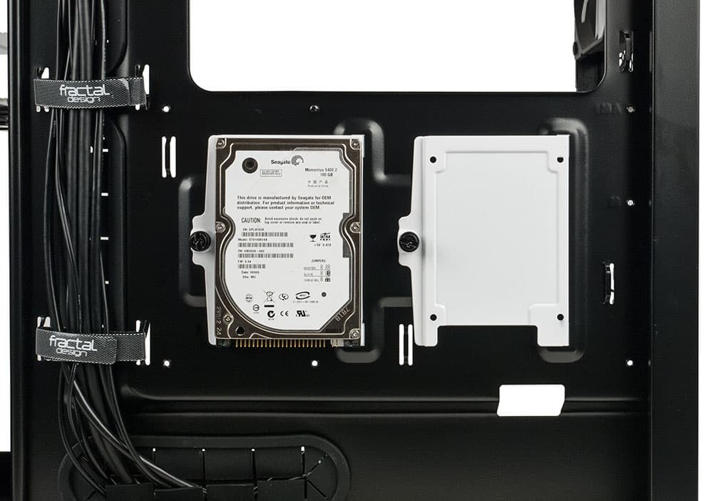 В обе части корзины накопители устанавливаются с помощью уже знакомых нам салазок, рассчитанных на 3,5- и 2,5-дюймовые HDD/SSD. А вот крепление двух 2,5-дюймовых накопителей за подложкой системной платы стало несравнимо более удобным: если в R4 они прикреплялись непосредственно к подложке, причем доступ к крепежным винтам перекрывался установленной системной платой, то теперь предусмотрены две съемные пластины. Так что можно уверенно сказать: в Define R5 количество реальных посадочных мест для HDD/SSD равно десяти.