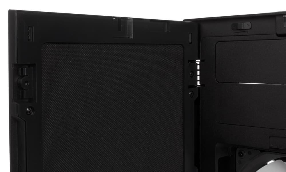 Несъемные части обеих петель служат защелками. Такая конструкция уже не требует наличия каких-либо амортизаторов: громких звуков при закрывании или открывании нет, да и особых усилий прикладывать не приходится. Наконец, наружная поверхность дверцы уже не глянцевая, а матовая, и отпечатков рук особо не боится. Ко всем этим моментам мы высказывали претензии в обзоре Define R4.