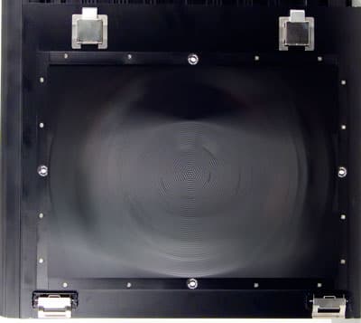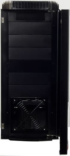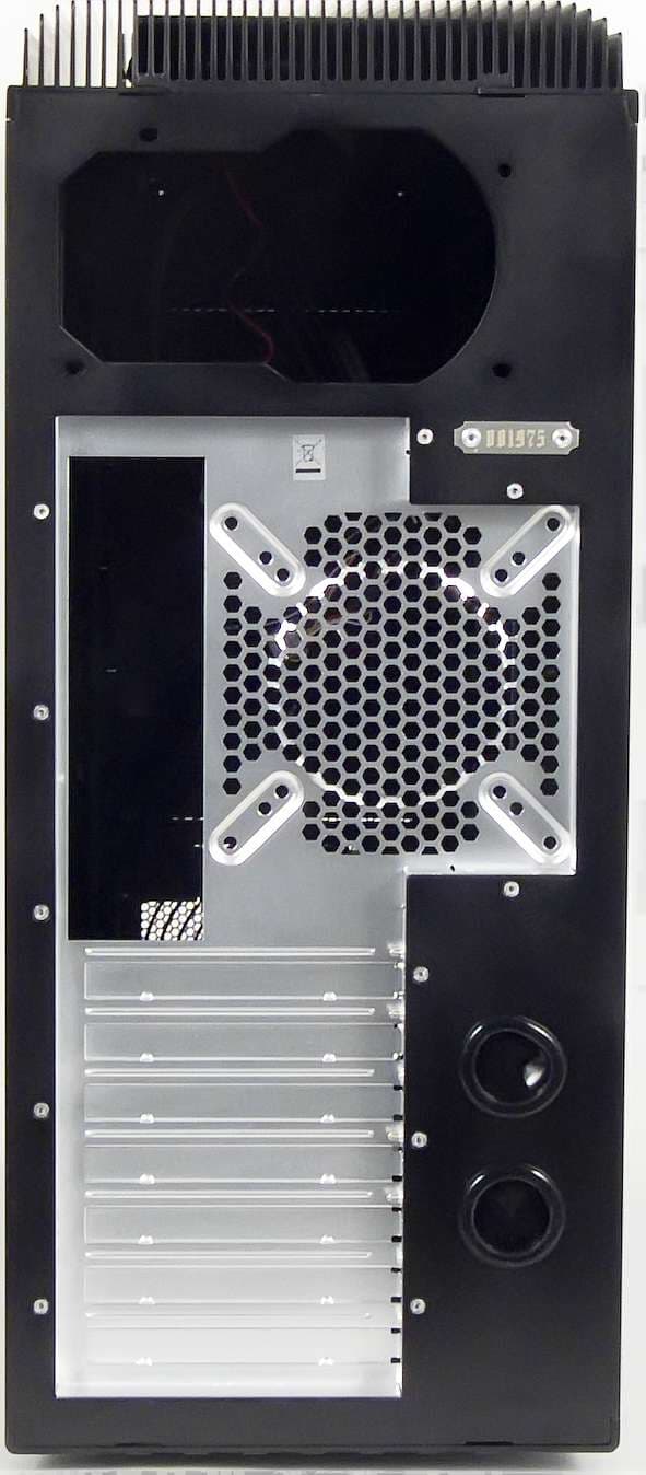 Задняя панель корпуса выполнена также из алюминиевого сплава, на ней расположено универсальное посадочное место для вентилятора типоразмера 80/90/120 мм, крепление вентилятора осуществляется с помощью винтов.