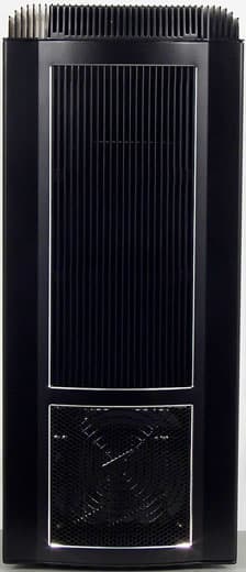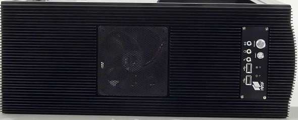 Верхняя часть корпуса, как уже было упомянуто, представляет собой радиатор не гигантских, но вполне внушительных размеров. Примерно по его центру расположено вентиляционное отверстие с установленным вытяжным вентилятором типоразмера 120 мм. Вентилятор прикрывает мелкоячеистая металлическая сетка, пылевой фильтр отсутствует, что при подобном расположении отверстия не является оправданным, так как при отключении вентилятора пыль начнет активно проникать внутрь корпуса, подчиняясь естественному действию силы тяжести. Также на верхней панели расположился блок управления и коммутации, то есть кнопки включения, перезагрузки и внешние разъемы ввода/вывода в составе:
