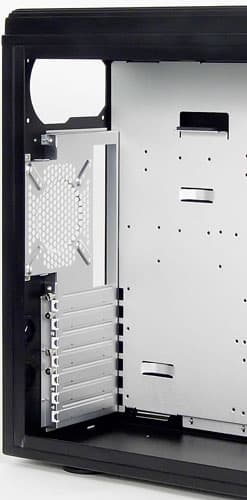Левая стенка выполнена сплошной, толщина боковых панелей составляет 2 мм. Жесткость их на кручение и изгиб можно оценить, как очень хорошую, и примерно аналогичную стенкам из 1 мм стального листа. Заслуга в этом не только толщины материала, но и размеров панелей, которые достаточно компактны, если сравнивать, к примеру, с корпусом Silverstone TJ-07, у которого аналогичные стенки имели недостаточную жесткость.