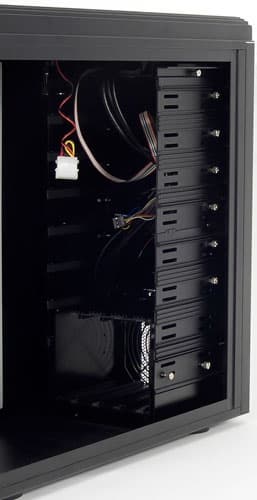 Две основные особенности, на которые стоит обратить внимание, — это размещение жестких дисков внутри корзины, а размещаются они вертикально боком, то есть стоя на ребре, а не горизонтально как обычно, и то, что сама корзина извлекается из корпуса со стороны передней панели последнего, для этого ее необходимо просто выдвинуть вперед, что существенно улучшает удобство при наличии длинных карт расширения, установленных в системе. Однако, крепление корзины осуществляется внутри корпуса, аналогично пятидюймовым устройствам, то есть при ее демонтаже придется открывать обе боковые панели и откручивать по четыре винта с накатной головкой с каждой стороны.