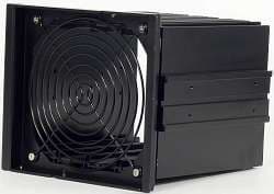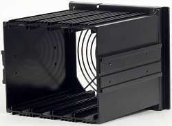 Интересно выполнен узел, предназначенный для установки пятидюймовых устройств и жестких дисков. В данном случае в корпусе предусмотрена конструкцией единый отсек для устройств типоразмера 5,25 дюйма, расположенный по всей высоте корпуса. В данный отсек устанавливаются две корзины для устройств типоразмера 3,5 дюйма — на одно и четыре места. При этом четырехместная корзина предназначена для жестких дисков, она не имеет внешнего доступа для устройств, оснащена резиновыми амортизаторами и большим вентиляционным отверстием спереди, правда, установка вентилятора и пылевого фильтра конструкцией не предусмотрены.