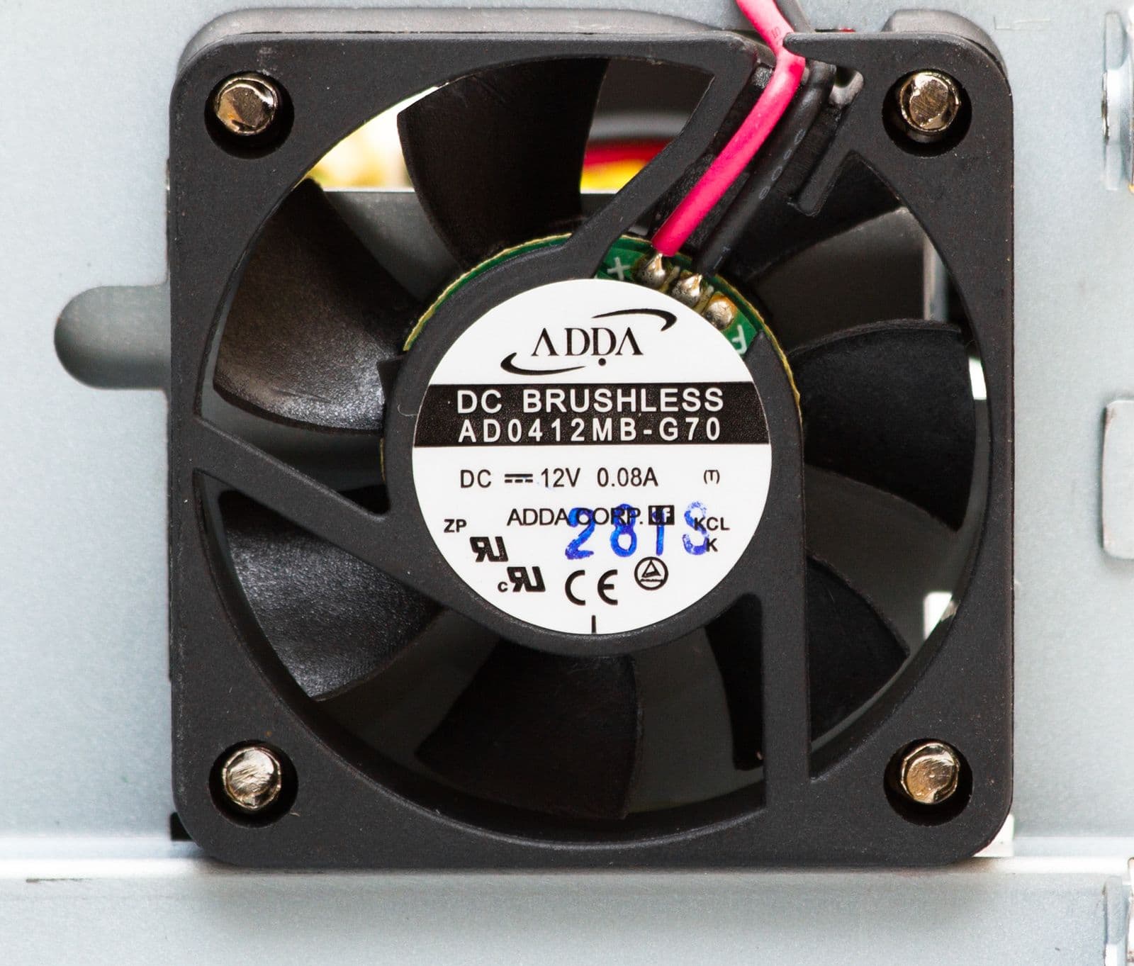 Блок питания охлаждается вентилятором типоразмера 40 мм, который установлен на боковой грани корпуса БП, забор воздуха он осуществляет не изнутри корпуса, а снаружи — через вентиляционное отверстие в днище корпуса. Вентилятор Adda AD0412MB-G70 основан на подшипнике качения.