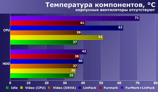- Video (CPU) и Video (DXVA) — просмотр ролика Full HD (BDRemux) с помощью плеера VLC 2.0 с выключенным и включенным аппаратным декодером в течение 1 часа.
