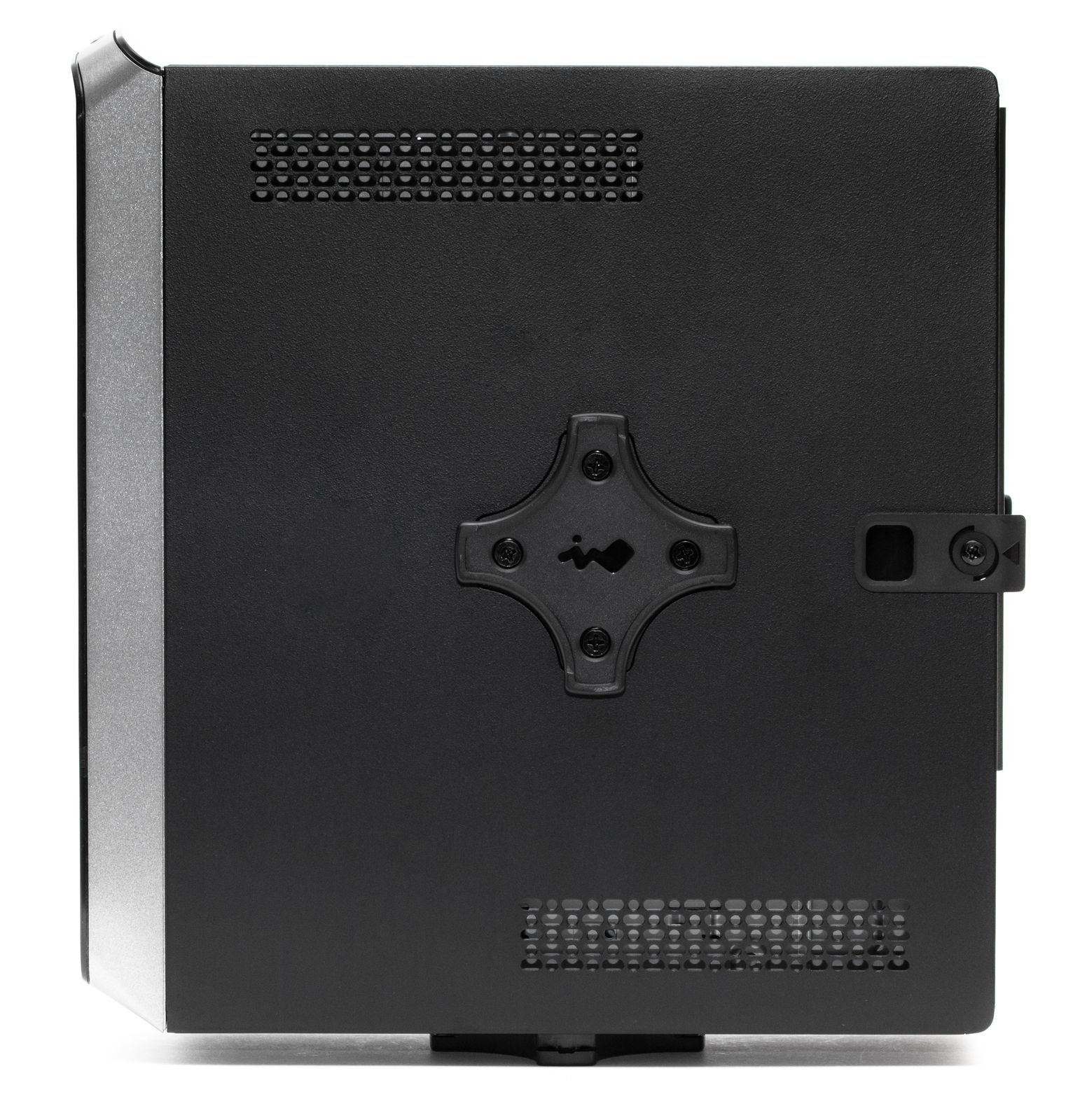 Корпус рассчитан на установку системных плат формата Mini-ITX и оснащен комплектным адаптером для крепления ПК на задней стенке монитора. По большому счету именно такое размещение и является для IW-BQ660S основным, на это дополнительно намекает отсутствие на самом корпусе фронтальных портов и кнопки включения — все эти элементы вынесены на отдельный проводной блок управления. Заметим, что в продаже можно встретить аналогичную модель без проводного блока, где традиционный набор портов и кнопка включения будут находиться на фронтальной панели.