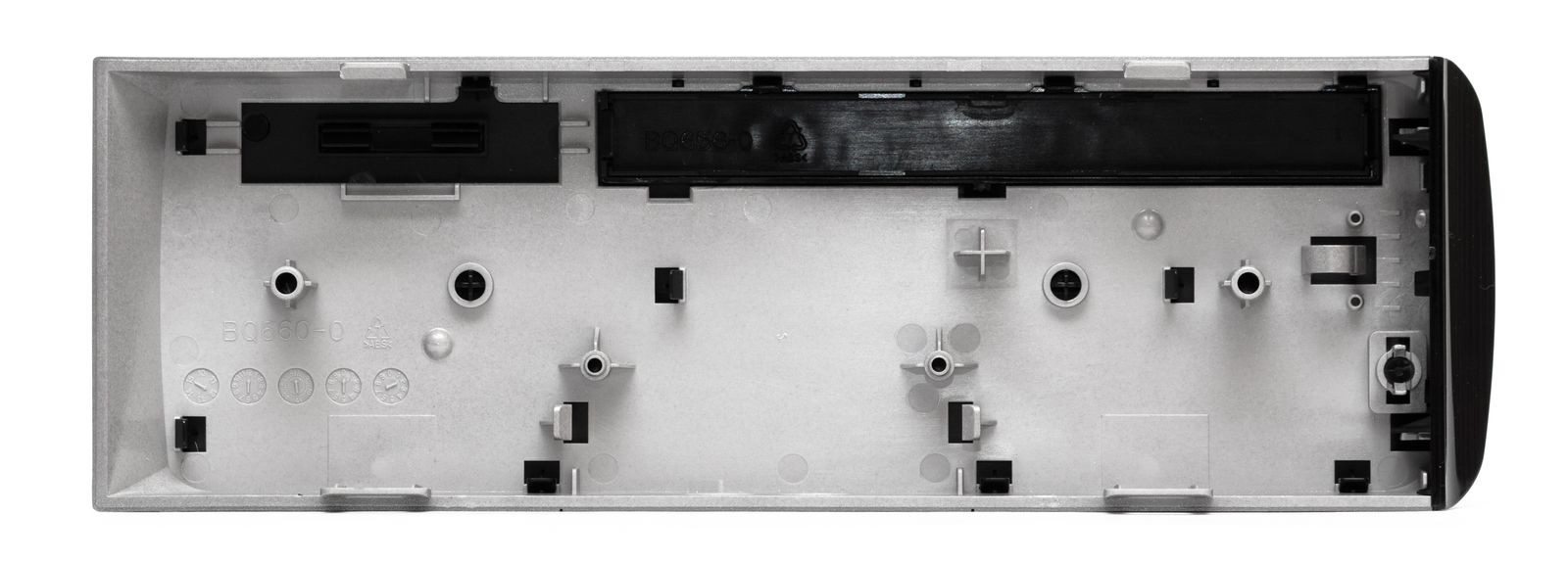 Декоративная передняя панель крепится за счет четырех пластиковых фиксаторов, получить доступ к которым можно только после снятия боковой стенки. Никаких проводов и контактов на фронтальной панели в нашем варианте IW-BQ660S нет. На верхней части передней панели присутствует прозрачный муляж кнопки Power, но никакой функции он не выполняет.