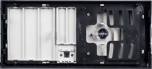 Передняя панель снимается очень легко, но тоже не совсем обычным образом. Её основные фиксаторы располагаются в самом низу, и для их освобождения нужно сдвинуть специально обученную пластиковую распорку, после чего просто потянуть панель на себя за выемку в нижней стенке. Распорка хоть и удобная, но, к сожалению, довольно хрупкая, поэтому обращаться с ней стоит аккуратно и бережно.