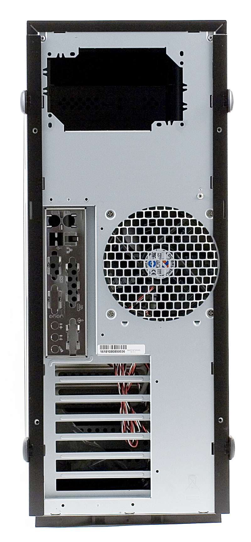 На задней поверхности предусмотрено одно посадочное место для вентилятора размером 12 см, комплектный установлен на выдув, крепление на винты, изнутри проволочная защитная решётка, снаружи прорези. Спереди, внизу, для обдува жёстких дисков стоят в пластиковой коробочке два вентилятора, размером 8 см на вдув, пластиковые жалюзи не съёмные. Хотелось бы их снять и установить один тихий 12 см на выдув, чтобы не шумел и пыль не собирал. Как мы уже упоминали, при желании, не составит труда установить на правой стенке 12 см (может, даже и большего размера) пропеллер на вдув, планка помехой не будет.
