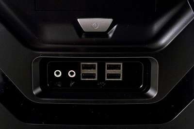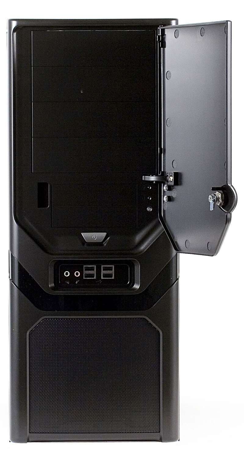 Выше — блок разъёмов, в углублении. Это четыре порта USB и два аудио. Расстояние между USB по горизонтали достаточное, около сантиметра, но по вертикали — всего около трёх миллиметров. И сама панель, и контактная площадка под ней съёмные, в разных вариантах могут содержать разные наборы разъёмов, причём вполне реально заменить их уже после покупки корпуса, при возникновении новых потребностей. Наконец, ещё выше находится дверка, запираемая на замок. Под ней — четыре 5,25" и два 3,5" отсека, кнопки включения (серебристая, сильно дрягается), перезагрузки, и пара светодиодов. Их видно и при закрытой крышке через окошечки-световоды. К достоинствам дверки относится тот факт, что её можно легко и быстро демонтировать, а оставшиеся конструктивные отверстия не будут сильно портить внешний вид корпуса. Впрочем, пока мы её не сняли, хотя сторонником дверок никогда не был. Крепится на пластиковые петли, открывается слева направо примерно на 110°. В целом, всё смотрится вполне симпатично, хотя и несколько брутально.