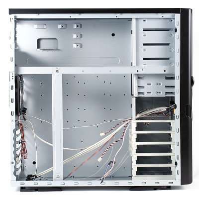 Шасси изготовлено из стали SECC толщиной 0,8 мм, все края аккуратно завальцованы, травмировать руки при сборке не должны. Обе боковые стенки съёмные, крепятся снизу за счёт П-образного жёлоба на них, сверху — на пять зацепов. Сзади крепление защёлками из пластика, но их можно снять и использовать винты, отверстия для этого предусмотрены. На левой стенке — три круговых ребра жёсткости, выполненных как элемент дизайна. На правой стенке — два таких ребра и большой круг, занятый вентиляционными отверстиями. При желании, не составит труда укрепить под ним 12 см вентилятор. Под правой стенкой предусмотрен микропереключатель датчика вскрытия корпуса, имеется петля для запирания её на замок.