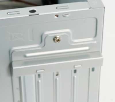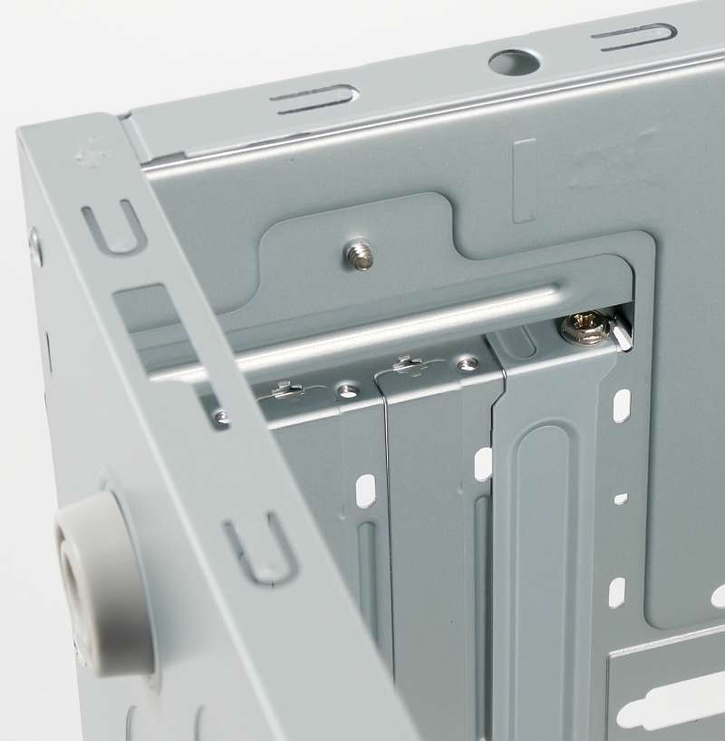 Крепление плат расширения осуществляется при помощи винтов, но способом, часто используемым в бюджетных корпусах, то есть, с вынесенным на внешнюю сторону задней стенки шасси, узлом крепления и прижимной планкой. Такое крепление использовать можно, но оно менее удобно, чем классический вариант.