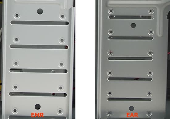 Прежде всего, стоит обратить внимание на ширину металлических полос по бокам прорезей, соединяющих отсеки. Ясно видно, что их ширина в корзине EAR заметно больше, чем в корпусе EMR.