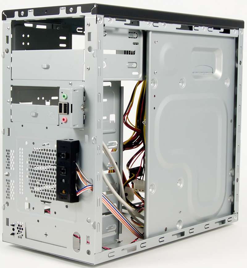 Корпус выполнен из стали толщиной 0,6 мм, что привычно для бюджетных моделей. Дизайну тестируемого корпуса не хочется уделять много внимания по двум причинам. Во-первых, казалось бы вполне гармоничное сочетание черного и серебристого цветов заезжено дизайнерами до такой степени, что ничего кроме негативной реакции не вызывает. Бывают, правда, исключения, но данный корпус в их число не входит. А во-вторых, компания Inwin позаботилась о том, чтобы у пользователя был богатый выбор с точки зрения дизайна, и сейчас для шасси EMR доступен весьма значительный ассортимент различных вариантов внешнего оформления корпусов на его основе.