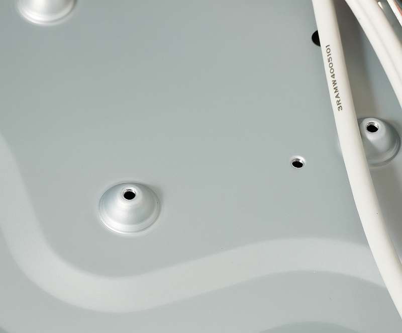 Установка системной платы осуществляется при помощи полусферических выштамповок, в которых есть отверстия с нарезанной резьбой под винт. Основание для системной платы представляет собой сплошной стальной лист, что также повышает жесткость всей конструкции.