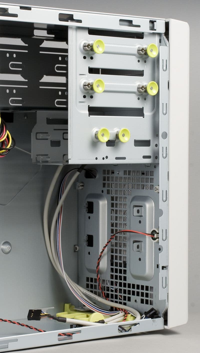 Установка устройств в верхний отсек типоразмера 3,5 дюйма осуществляется при помощи системы безвинтового крепления, полностью аналогичной уже описанной, а в нижний отсек — только при помощи винтов. Но установить жесткие диски в эти отсеки без приложения ненормативных усилий или доработки, заключающейся в отгибании прижимных «язычков» с шипами, расположенных с левой стороны отсека, не представляется возможным. Зато жесткий диск прекрасно устанавливается на посадочное место, расположенное с внутренней стороны передней стенки шасси. Крепление HDD осуществляется, как с внутренней стороны стенки, с помощью двух зацепов и двух винтов, так и с внешней стороны, то есть под передней панелью, с помощью четырех винтов. Крепление надежное, правда, при ориентации диска разъемами вверх не слишком удобно эти разъемы подключать.