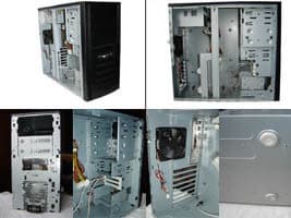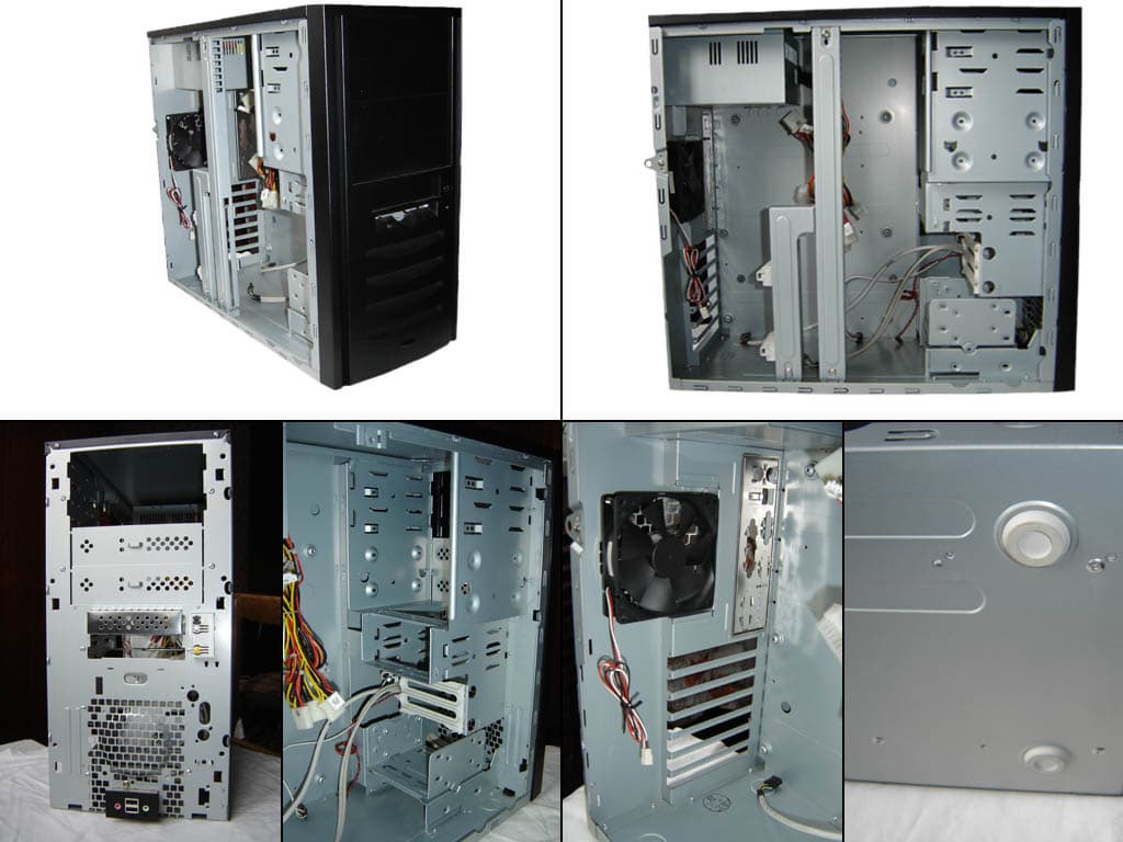 Раскрываем. Внутри корпуса достаточно свободного места для установки комплектующих. Боковое ребро жесткости необычной Ч-образной формы сделано съемным для удобства сборки/разборки. PCI-заглушки и самоклеющиеся резиновые ножки пользователь должен установить сам. В этот корпус можно устанавливать полноразмерные платы расширения, для их крепления предусмотрен фиксатор, располагающийся под отсеком для дисковода.