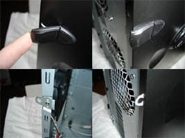 Крепление боковых стенок осуществляется с помощью фирменных защелок. Надо сказать, что это крепление весьма удобно и существенно ускоряет процесс открытия/закрытия боковой стенки. Так же возможно крепление при помощи обычных винтов. Для защиты от нежелательного вскрытия системного блока предусмотрена петля для навесного замка.