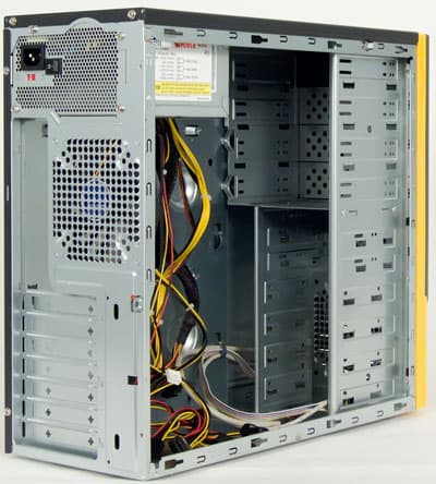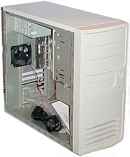 Далее, следует упрощенный вариант предыдущего технического решения — размещение блока питания внизу общего объема корпуса вместе с остальными комплектующими. Место расположения то же — у задней стенки корпуса. Достоинство в виде расположения блока питания в одном из наиболее прохладных мест корпуса сохраняется, но при этом отсутствует изолирующая перегородка, вследствие чего повышается зависимость температуры БП от общей температуры в корпусе. Зато такой вариант дешевле в реализации, и корпуса, построенные по данной схеме, стоят от $100, тогда как корпуса с горизонтальной перегородкой дешевле $200 не встречаются, а обычно они стоят еще дороже.