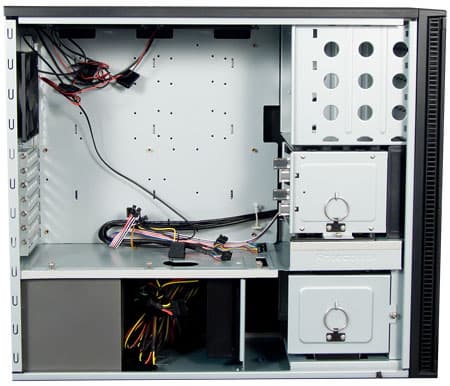 Из наиболее удачных вариантов компоновки корпуса стоит отметить вариант с размещением блока питания в отдельном отсеке внизу корпуса, отделяемом от основного объема сплошной горизонтальной перегородкой, за счет чего достигается хорошая теплоизоляция блока питания от остальных компонентов. Что это дает пользователю? Прежде всего, снижение шума блока питания за счет отсутствия его дополнительного нагрева горячим воздухом от систем охлаждения процессора и видеокарты, который согласно законам физики, поднимается как раз вверх, к стандартному месту установки блока питания.