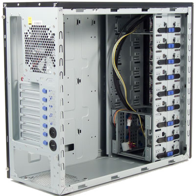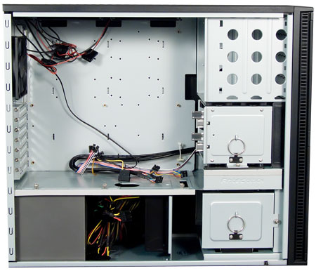 Интересным и весьма удачным решением, которое находит применение в корпусах ценовой категории от $100, является размещение по всей высоте корпуса единого отсека для устройств типоразмера 5,25", в который модульно устанавливаются корзины для жестких дисков или адаптеры для устройств типоразмера 3,5" с внешним доступом. Данное техническое решение, помимо возможности изменения расположения жестких дисков по всей высоте корпуса, позволяет с большой эффективностью использовать внутренний объем корпуса, устанавливая необходимые накопители с помощью соответствующих адаптеров, которые продаются отдельно и производятся, в том числе и сторонними компаниями. Подобные компоновочные решения достаточно широко применяют компании Hiper, Cooler Master и Antec.