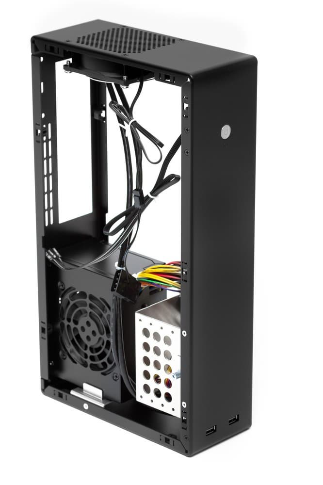 Конструкция корпуса очень проста, она не предусматривает установку устройств с внешним доступом, полноразмерных жестких дисков и каких-либо плат расширения. Малая толщина корпуса накладывает весьма строгие ограничения на максимальную высоту процессорного кулера, она не должна превышать 55 мм.