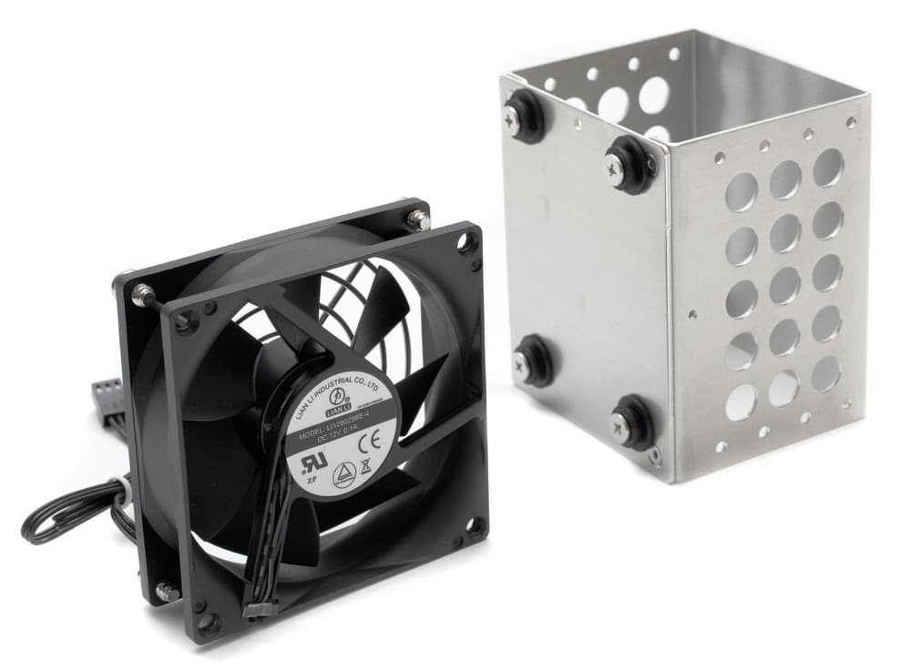 Lian Li PC-Q12 предусматривает установку всего одного корпусного вентилятора, который уже идет в комплекте поставки. Посадочное место расположено на верхней стенке, оно рассчитано на установку вентиляторов типоразмера 80 мм. Модель предустановленного охладителя — LI128025BE-4. Номинальная скорость вращения составляет всего 1200 об/мин, что очень мало, но зато и практически бесшумно. Вентилятор работает на выдув, над лопастями имеется защитная решетка, выполняющая также и декоративную функцию.
